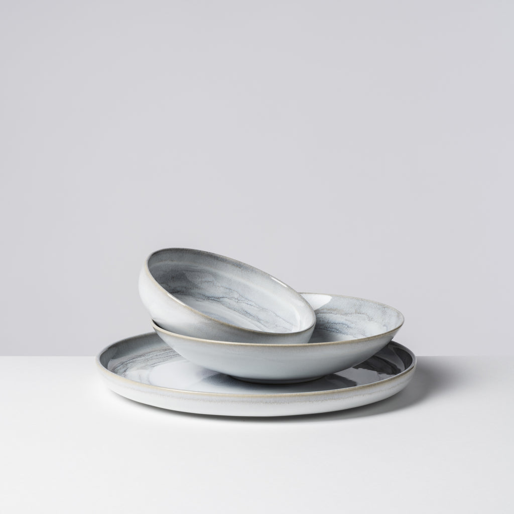 Dieses 12 teilige Speiseservice aus der Kollektion Tiefer See umfasst 4 große Speiseteller, 4 tiefe Teller bzw. große Schalen sowie 4 Müslischalen. Die ausgewogene Kombination aus prägnanten Scandi-Formen mit eleganten Coupe-Formen gibt dem Set einen ganz besonderen Charakter. Dieses Service lässt sich perfekt mit einem Kaffeeservice aus der gleichen Kollektion ergänzen. Wähle Deinen Favoriten aus den zeitlos-schönen Farbvarianten Grün-Blau oder Grau-Weiß und bringe skandinavisches Flair auf den Tisch.